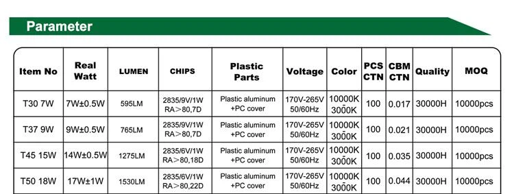 T37 9W It is chosen mostly in many market,and is moderate in size suitable for many scenarios.Using 7D SMD 2835 chips of MLS,90-100lm/w,CRI>80Ra,the PC cover is over 90% light transmittance,the nickel-plated base B27 B22 E14 to choice available.